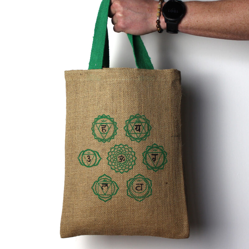 Stylowa i ekologiczna torba z juty prosto z Indii, ozdobiona symbolami czakr, idealna dla osób praktykujących jogę, medytację i świadome życie. Naturalny, surowy wygląd i zielone zdobienia sprawiają, że świetnie komponuje się z duchowym i minimalistycznym stylem.