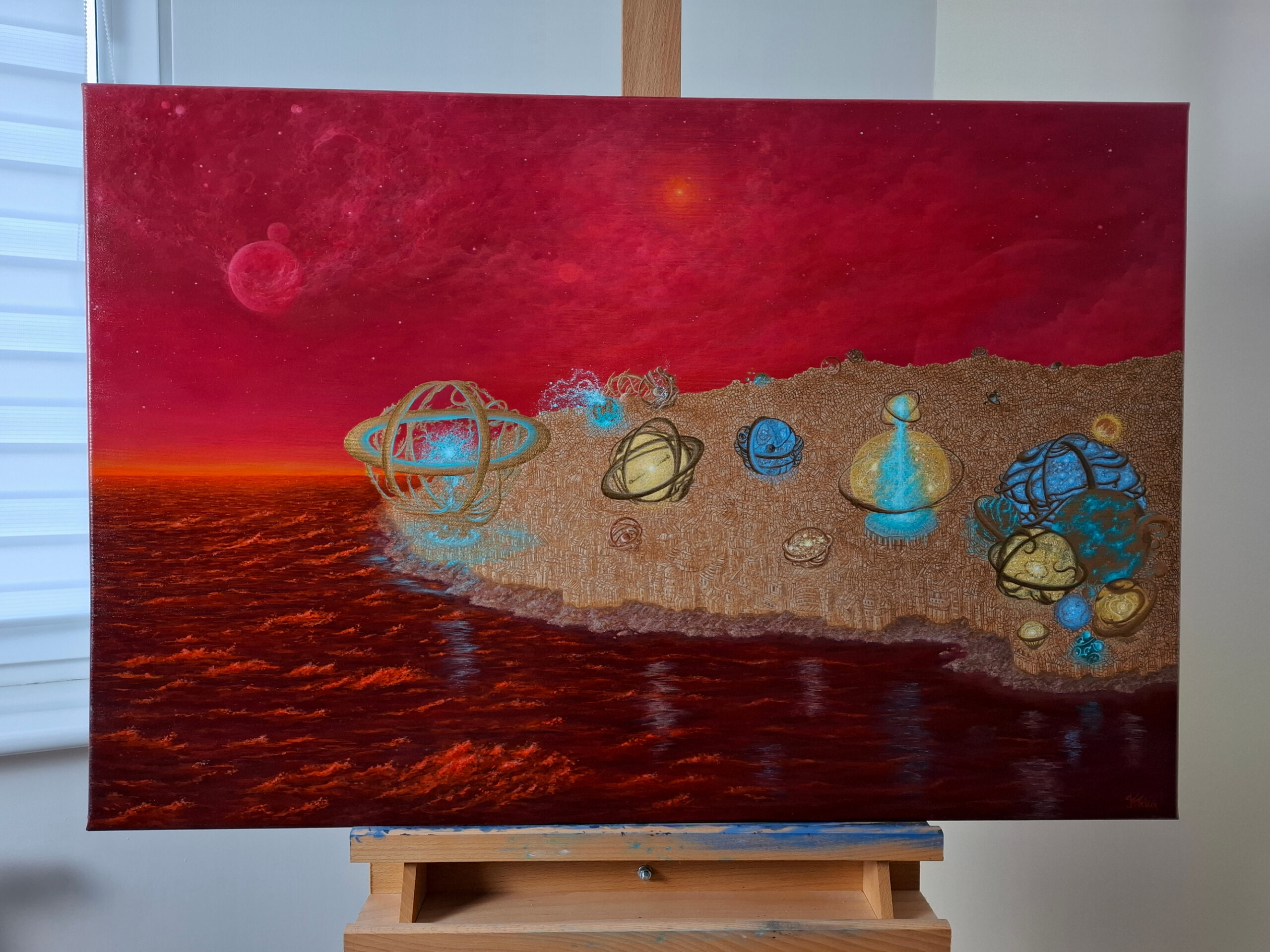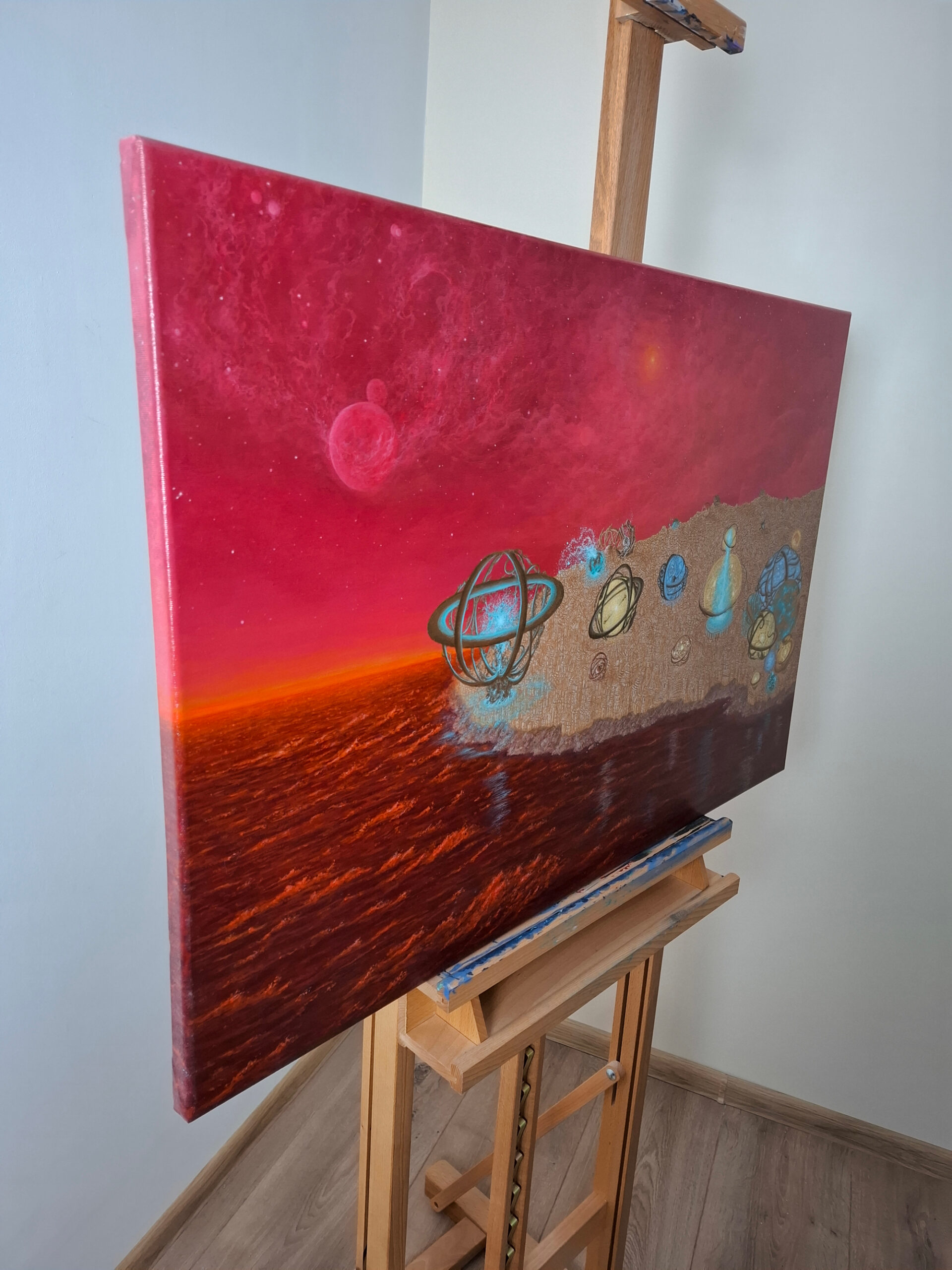 Obraz przedstawia niezwykłe, futurystyczne miasto, którego architektura przypomina starożytne astrolabia – przyrządy służące do odczytywania pozycji gwiazd. Konstrukcje na płótnie wydają się zawieszone pomiędzy światem fizycznym a energetycznym, pulsując złotym i niebieskim światłem. Kosmiczne tło i pulsujące czerwienią niebo nadają całości onirycznego, niemal metafizycznego charakteru.