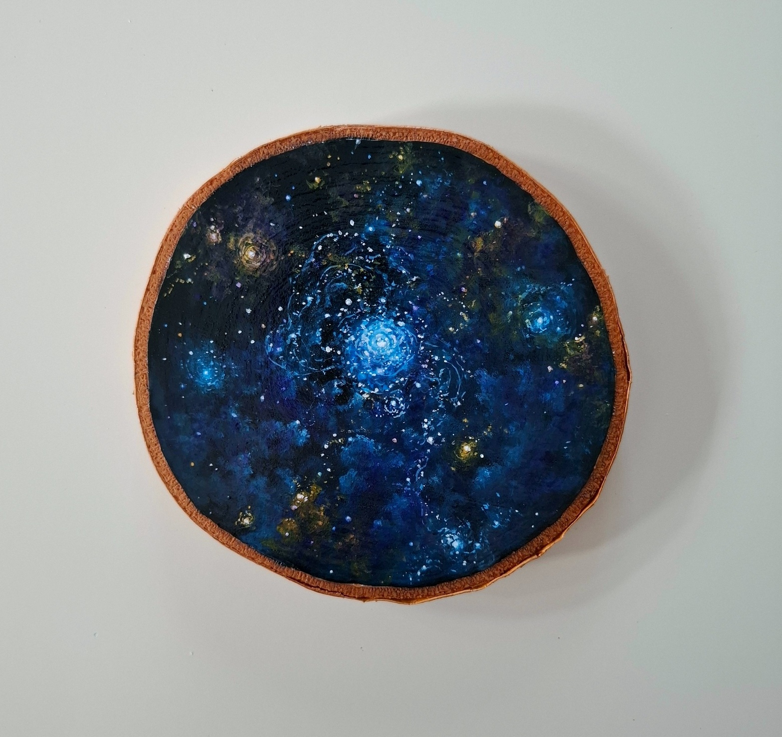 Obraz akrylowy namalowany farbami Golden na szlifowanym plastrze drewna (brzoza), zawerniksowany, sygnowany z tyłu, średnica: 14 cm, data powstania: 2024.
