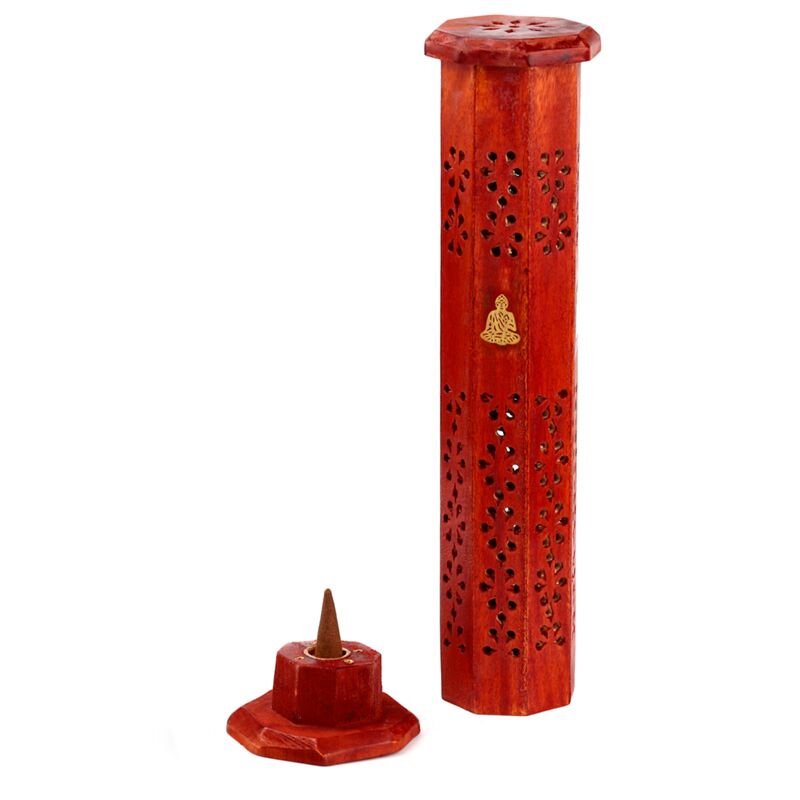 Ta elegancka popielnica w formie wieży została wykonana z naturalnego drewna mango i ozdobiona mosiężnym symbolem Buddy. Jej misternie rzeźbione ścianki pozwalają na swobodny przepływ dymu, tworząc piękne, delikatne efekty w powietrzu.