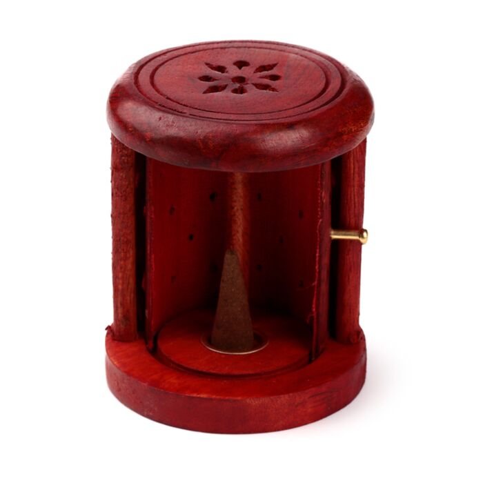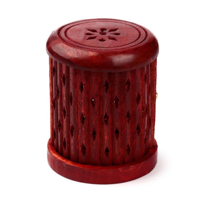 Praktyczne i estetyczne pudełko z drewna mango do palenia kadzidełek stożkowych, wyposażone w zamykane drzwiczki. Wykonane z naturalnego drewna, ozdobione subtelnymi wycięciami w kształcie kwiatu, które umożliwiają delikatne uwalnianie aromatycznego dymu.